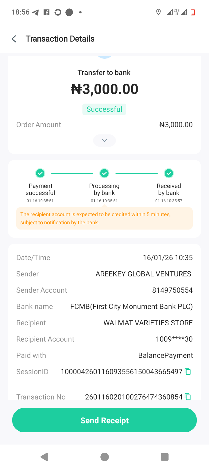 Payment for previous order delivery fee of #3000 to Ibadan using Areekey global venture to make payment.